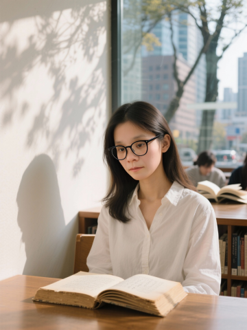 写实风格的东亚风场景,柔和光影洒落,营造清新文艺氛围。人物静读,实景感十足,印刷质感书籍增添舒适阅读体验。