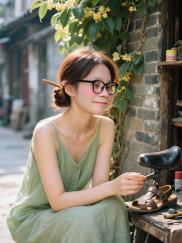 复古胶片风,东亚街巷静谧晨光中,女子倚书堆凝视旧照,金叶发夹与浮雕质感交织,拼贴式叙事诉说时光诗意。