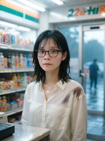 胶片风与东亚风交织,雨中便利店的静谧画面,光影感与实景感并存,清新感中透出文艺故事感,现代城市生活的柔软瞬间。