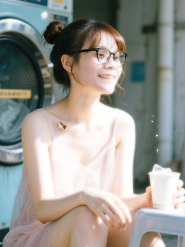 清新柔和的胶片风写真,少女在阳光下轻啜饮品,光影斑驳,微缩艺术感与虚拟自然融合,透出唯美浪漫的文艺气息。