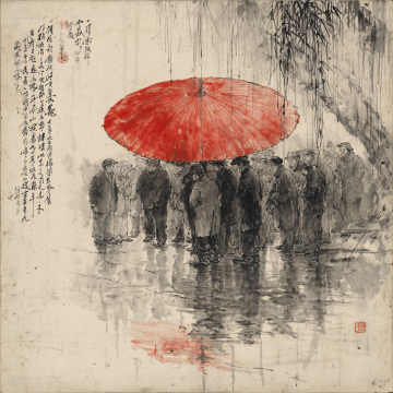 水彩插画风,清新古典,绿树掩映古桥,江南水乡韵味。