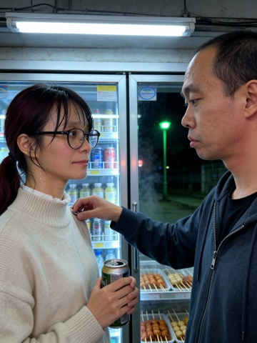 工业感隧道中,光影交织,男女对坐,男子轻拭女子手伤,质朴温情流淌。实景感与故事感交融,文艺氛围浓厚,肌理细节凸显沉郁而柔和的视觉风格。