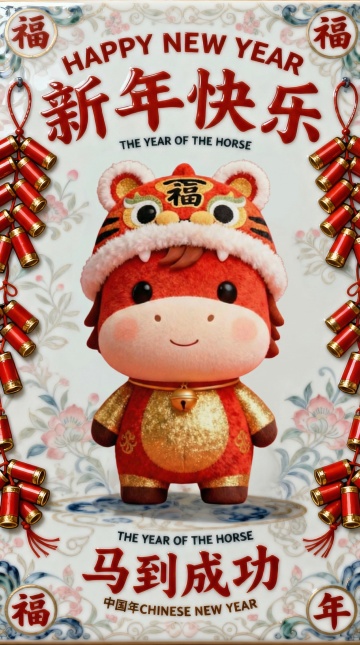软萌马戴舞狮帽,毛发生长质感十足,国潮红金配色,鞭炮环绕,喜庆卡通感爆棚,新春氛围拉满。
