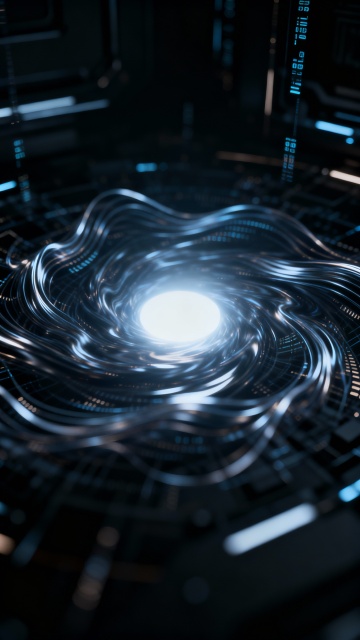3D渲染风格的科技感背景,以深邃的深蓝色为基底,融合渐变的紫色与粉色光晕,营造出神秘而未来的氛围。画面中心是一个由多层同心圆构成的复杂几何结构,表面布满精密的电路纹理和发光节点,呈现出类似高科技芯片或宇宙星图的质感。从中心向外延伸出无数细长的发光线条,线条顶端有明亮的光点,仿佛数据流动或能量射线。整体光影效果突出,具有强烈的金属光泽和玻璃质感,高光与阴影对比鲜明,边缘处有柔和的光晕扩散。背景中点缀着大小不一的光斑和粒子,增强空间的深邃感和科技感。整体构图采用中心聚焦式,视觉层级清晰,主体结构突出,色彩和谐统一,充满未来主义和科幻感,能高效传达科技、创新、前沿的核心概念。