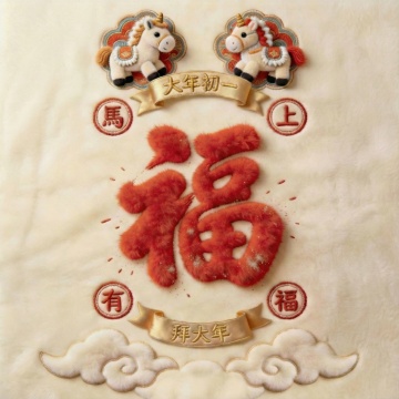 刺绣风国潮设计,拟人化独角兽萌趣十足,搭配金元宝与祥云,喜庆可爱;“发财”大字醒目,寓意万事如意,节日氛围浓厚。