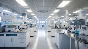 一个干净规整的现代化实验室场景,采用写实风格,以蓝白色调为主,光线明亮柔和,具有清晰的光影层次和细腻的质感表现。画面中可见身着白色防护服的研究人员在先进的白色和蓝色精密仪器设备旁工作,背景是带有规则几何图案的白色墙面。构图采用三分法,空间感强,整体氛围专业、严谨、科技感十足,适合作为背景使用。