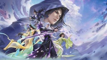 游戏角度设定,女性修仙者人物角色,2D卡通风格,不同的服饰配色,仙侠主题,仙侠人物,修仙人物,站在飞剑上在天上往左飞,仙气飘飘,大师构图,人物侧面视角,细节层次丰富,奢华,结构复杂,高质量,单个场景,完整展示,平视角度构图,居中展示,无外发光,内容不超画面,净纯色背景