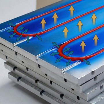 白色背景下,三层不同结构的透明材质叠层设计,最上层为带有细密六边形孔洞的平面层,中间层呈现波浪状起伏并同样布满小孔,底层是规则排列的半球形凸起结构,三个向上的蓝色箭头从叠层中心位置发出,整体采用科技感的蓝白渐变色调,光影柔和,具有清晰的结构层次感和半透明质感,展现产品的透气性与支撑性,设计风格简洁现代,偏向功能性产品的技术展示图。
