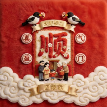 刺绣风与毛发生长风结合,复古中式国潮设计,浮雕质感突出,重拟物手法呈现喜庆节庆氛围,正月初八“顺星”主题,象征丰收与祥瑞。