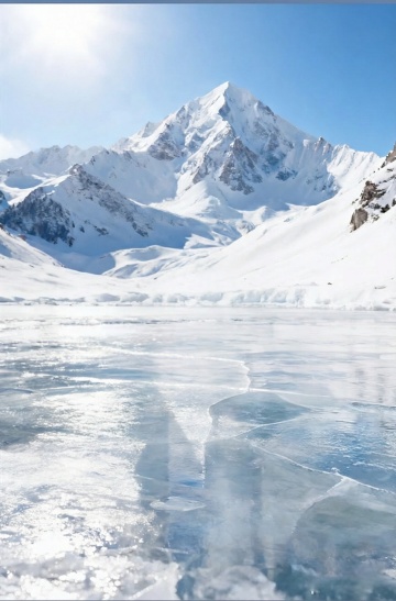 写实主义摄影风格的雪山全景,湛蓝纯净的天空中点缀着几缕形态各异的絮状白云,画面中央矗立着巍峨的雪峰,山顶覆盖着厚实的积雪,山脊线锐利清晰,阳光照射下的雪面呈现出明亮的高光与柔和的阴影过渡,山体下部为深褐色岩石,岩石纹理粗糙且层次分明,近处的山峦呈现出暖棕色与深褐色的渐变,山谷间可见部分冰川痕迹,整体光影为清晨或傍晚的侧逆光效果,营造出壮阔、宁静而神圣的氛围,增加几处山间飘动的薄雾,使画面增添一丝朦胧的神秘感。