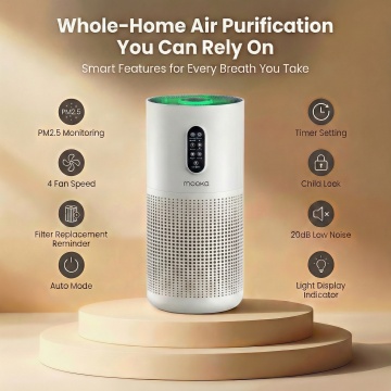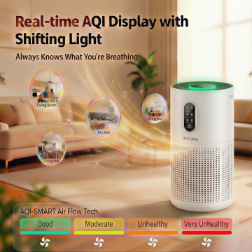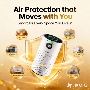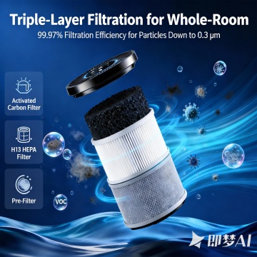 简约主义风格,融合性冷淡风与轻拟物设计,蓝木椅搭配柔和布艺,营造舒适清新氛围,科技感空气净化器点缀现代生活美学。