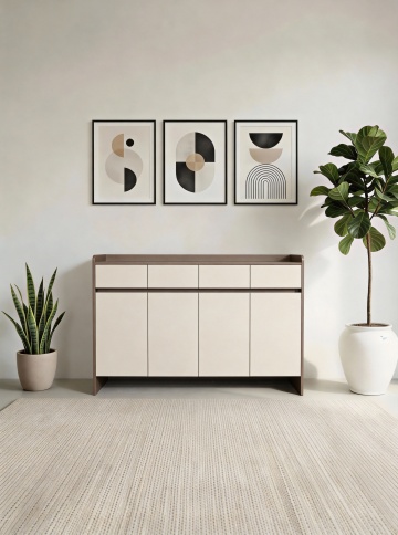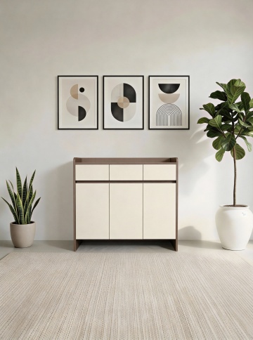 3D渲染风格的玄关场景,柔和自然光从右侧窗户洒落,形成温暖的光影效果,浅色木地板带有自然纹理和柔和反光,中央位置是一扇浅木色的简约平板门,门把为黑色金属材质,门的左侧是一个浅木色矮柜,上面摆放着两个白色陶瓷花瓶和一个金属装饰品,右侧是一个同色系的多层储物柜,顶部放置着插有干花的透明花瓶,墙面为纯白色,挂有三幅简约线条装饰画,地面铺有几何图案的深色地毯,整体色调以原木色、白色和浅灰色为主,营造出宁静、简约、自然的北欧家居氛围。