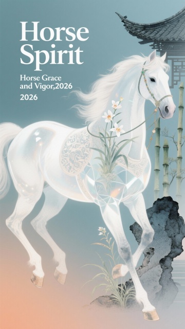 国潮风剪影马踏祥云,鎏金月华倾泻,浮雕山水映辉,光影流动间尽显中式古典与梦幻喜庆,寓意马年大吉。