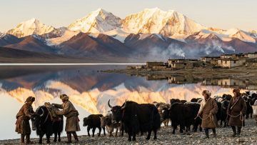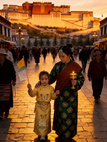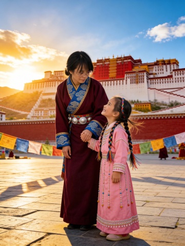 黄昏光影中,母女身着刺绣华服,手持经幡与酥油灯,行于布达拉宫前,民族感与神圣感交融,中式古典美学尽显优雅与厚重。