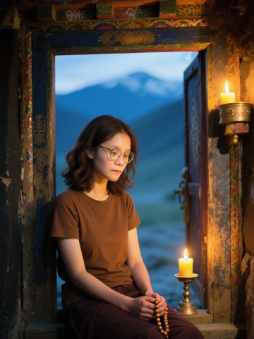 静谧光影中,女子于藏式木雕窗前凝思,烛火摇曳,远山如画,中式民族风与油画质感交融,实景浮雕感尽显禅意。