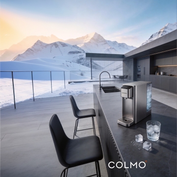 现代化厨房场景,白色大理石台面,嵌入式不锈钢厨具,台面上摆放着一台智能咖啡机作为展示产品,阳光从右侧窗户洒入,照亮台面和产品,整体色调明亮干净,细节清晰