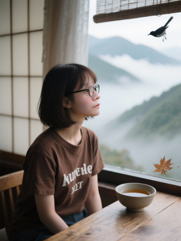 水墨风与水彩风交融的东亚意境,静谧中透出文艺感,实景质感搭配柔和光影,质朴木桌与茶碗诉说舒适日常,窗外山雾缭绕,飞鸟掠过,尽显中式禅意。