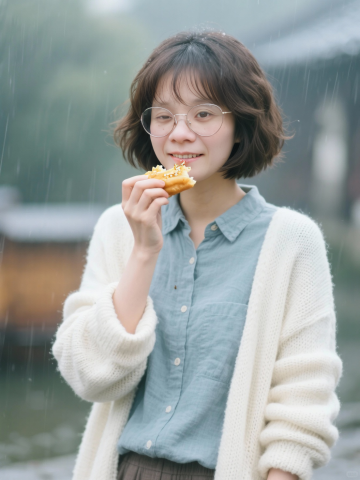 雨中轻食,东亚风文艺少女,柔和朦胧的实景感,面料质感细腻,清新舒适,传递春日静谧氛围。