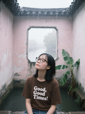 水墨风庭院雨景,胶片质感呈现中式静谧,人物凝望天光,文艺与国潮交融,朦胧中透出时光的诗意。