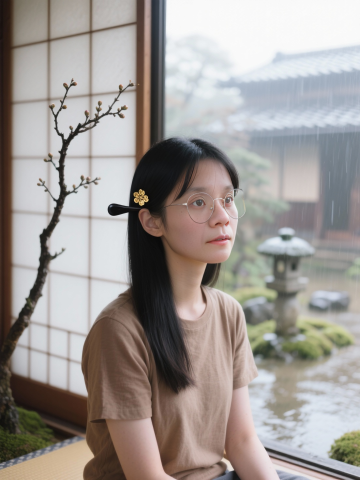 水墨风写意,静谧古典的东亚庭院中,雨落石灯,女子凝望窗外,发簪点金,实景感十足。