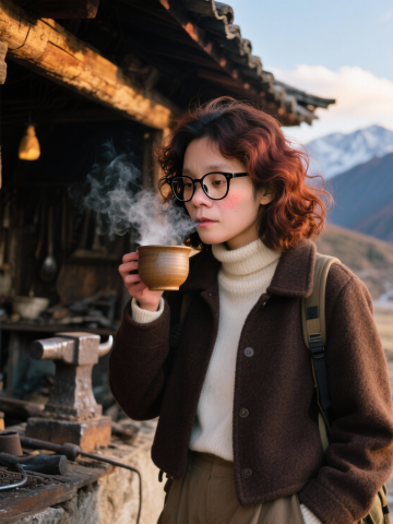 复古感与中式感交织,实景光影下,暖意融融的胶片风画面,女子捧杯热茶,质朴而文艺,东方意境跃然眼前。