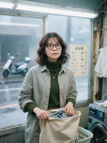 胶片风质感,东亚街头日常场景,雨中洗衣店的质朴与文艺交织,柔和光影勾勒出舒适氛围,工业元素与自然光共舞,展现生活本真之美。