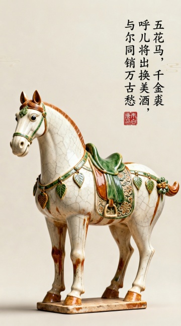 陶瓷风唐马,浮雕质感,重拟物设计,3D呈现古典中式韵味,配以李白诗文,尽显优雅文艺气息。
