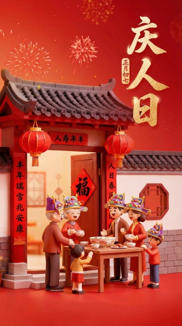 国潮风插画,融合3D混合材质与微缩艺术,展现新春团圆宴与虚拟舞狮,鎏金浮雕点缀,古典中式庭院间流淌温馨故事感。