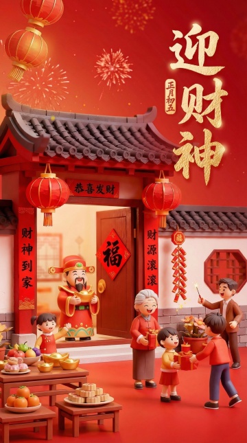软3D毛绒质感插画,卡通财神喜迎新春,红灯笼与烟花点缀夜空,粘土风建筑与金元宝营造浓厚节日氛围。