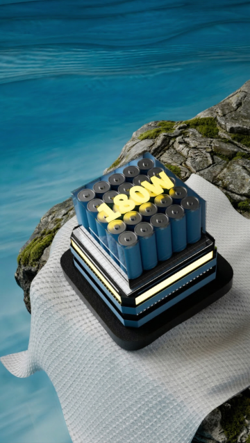高清晰写实摄影风格,画面中央是一块表面光滑、带有自然纹理的深灰色展台,展台底部与水面接触,周围环绕着流动的蓝色透明水体,水以优雅的环形涟漪形态从展台四周向外扩散,涟漪边缘泛着细碎的白色浪花,阳光从画面上方斜射下来,在水面和展台表面形成明亮的高光和闪烁的光斑,背景是柔和的浅蓝色天空与朦胧的远山轮廓,整体营造出宁静、清新且富有质感的氛围,光影层次分明,色彩以深浅不一的蓝色为主调,展现出水的透明感和展台的坚实质感。