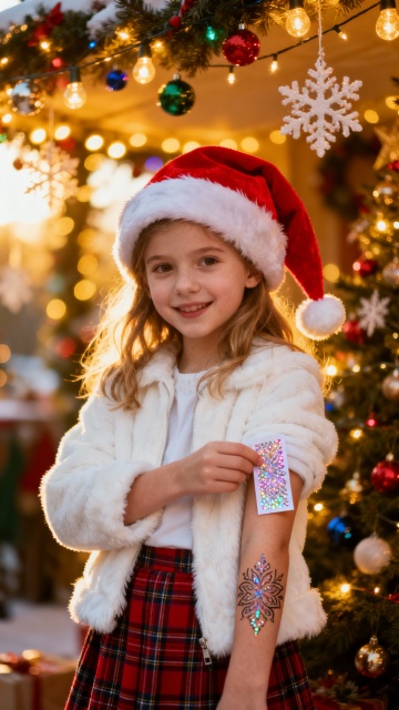雪夜小镇,彩灯闪烁,圣诞树璀璨,孩童嬉戏,暖光映雪,节日氛围浓郁而温馨。