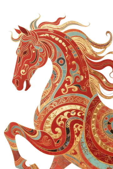 红底金饰的骏马,融合中式古典与鎏金风韵,厚涂技法呈现油画质感,插画风格尽显奢华与重拟物细节。