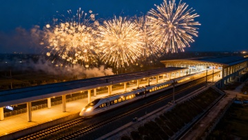 极致的仰视视角超强纵深透视,螺旋环绕构图,祥云环绕贯穿整个画面,北京、上海、深圳等标志性建筑矗立其中,几千架发光的无人机组成“中国”的字样,从城市里向红色调的星空飞去,城市里的人震惊这神奇的一幕,许多人举起手机记录这一幕,满月,超强透视。国家富强昌盛,人民安康乐业的景象。