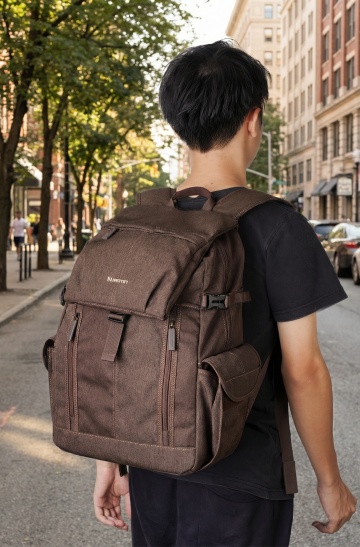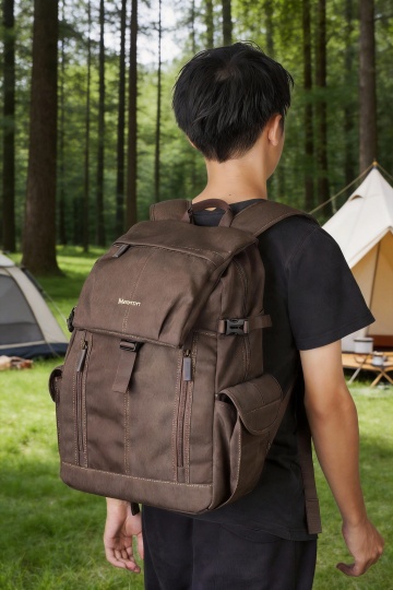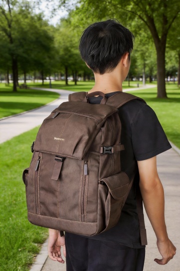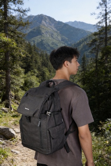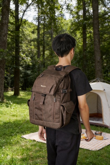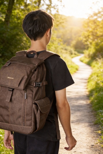 简约主义风格,柔和色调背包置于温暖阳光下,营造舒适感与宁静氛围。