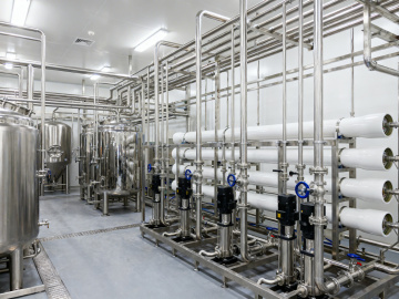 现代化工业场景,蓝色为主色调,清新明亮的光线,干净整洁的生产线,透明玻璃幕墙外是蓝天白云,绿色植物点缀在车间角落,机械臂精准运作,地面反光如镜,整体氛围充满科技感与希望
