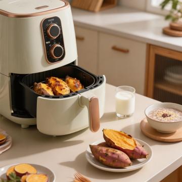米白色电饭煲,周围环绕厨房台面及新鲜食材(白米、稻穗、绿叶蔬菜),现代简约风格,温馨自然氛围,明亮柔和光线,高清质感,白色背景的要求,