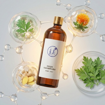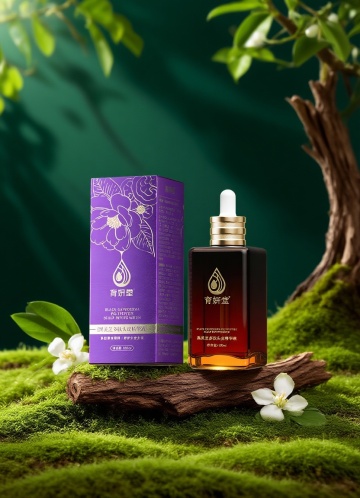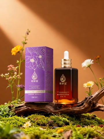 国潮风与重拟物风融合,鎏金瓶盖搭配紫金包装,置于青苔绿植间,清新优雅,唯美感十足,实景感强,传递自然与东方美学的和谐之美。