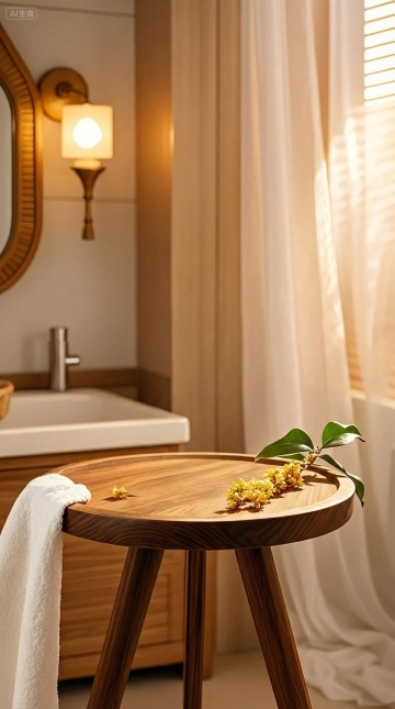 极简主义风格浴室设计,柔和的米白色墙面,温暖的自然光透过白色窗帘洒入,形成柔和的光影效果,地面铺设浅色大理石瓷砖,中央放置一个造型简约的独立式白色浴缸,黄铜色金属水龙头,浴缸旁地面随意摆放一条浅灰色柔软毛巾,右侧角落有一盆绿色植物置于编织篮中,整体氛围宁静、优雅、舒适,布局简洁开阔,空间感强,材质质感细腻,色彩和谐统一,营造出高级而温馨的沐浴环境。