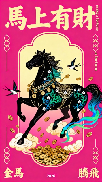 国潮插画风,融合中式元素与鎏金质感,马踏祥云衔金元宝,燕子飞舞,象征喜庆吉祥。大字“马上发财”呼应2026年生肖马,传递民族喜庆与财富祝福。