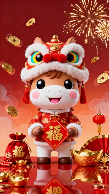 软3D毛绒风格,卡通童趣女孩骑红马,喜庆春节元素环绕,粘土质感与毛发生长细节融合,营造温暖可爱的节日氛围。