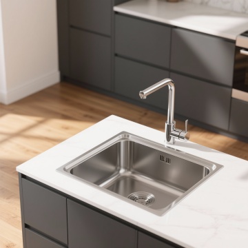 超写实3D渲染的现代厨房水龙头特写,极简主义设计风格,银色金属质感水龙头搭配可旋转出水口,安装在白色光滑人造石台面上,嵌入式不锈钢水槽带有圆形排水口,下方为深灰色哑光橱柜配银色长条形拉手,背景是浅色木质地板,柔和自然光从上方照射形成细腻高光与阴影,整体呈现干净、高级、宁静的氛围,注重材质纹理细节与空间层次感,不同角度展示水龙头在现代厨房环境中的多种布局搭配。