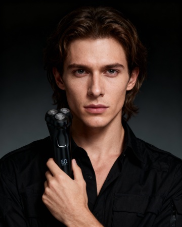 科技感与实景感交融,3D风金属质感剃须刀立于浪花岩石之上,光影流动间展现未来感与清爽清透的商务美学。