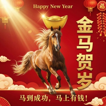 国潮插画风,红色骏马奔腾,寓意马到成功,喜庆中式设计,大字突出祝福。
