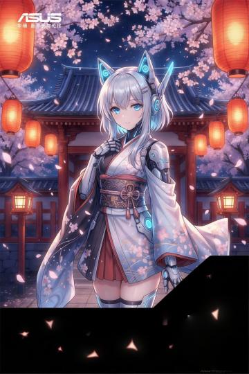 动漫风少女融合赛博朋克元素,身着科技和服立于樱花夜景中,霓虹灯笼与粒子光效交织,展现梦幻与未来感的唯美碰撞。