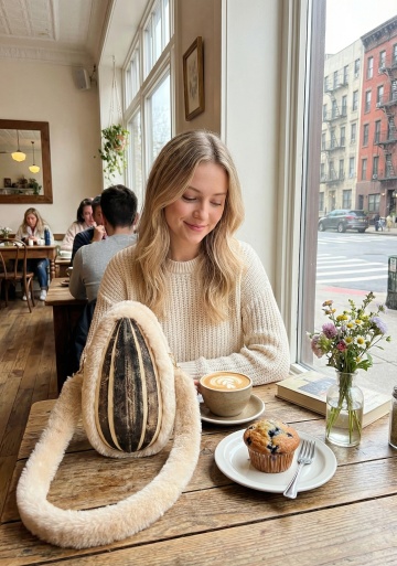 暖调灯光下的咖啡馆,女孩身着柔软毛衣与格纹裤,搭配手账风笔记本与动漫草图墙,营造出温馨、舒适又文艺的氛围。