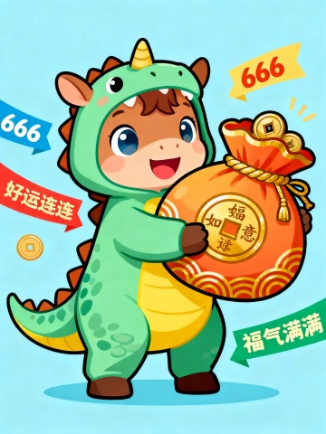 卡通风格小马拟人化穿恐龙服,怀抱福袋,彩绘风呈现国潮喜庆感,666与好运元素点缀,充满节日祝福氛围。