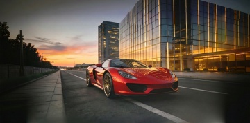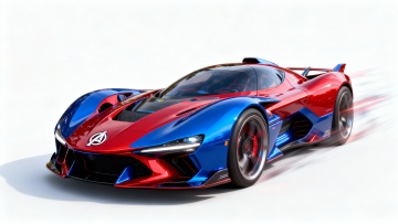 赛博朋克风格的未来都市夜景,一辆流线型设计的亮红色超级跑车在湿滑的街道上高速行驶,车身带有锐利的棱角和巨大的尾翼,车头灯发出明亮的蓝白色光芒,地面反射着霓虹灯光形成彩色光轨,周围是高耸入云的摩天大楼,楼体上布满闪烁的电子广告牌和发光霓虹招牌,整体画面充满动感与速度感,色彩以深蓝、紫色、粉色和红色为主色调,光影对比强烈,营造出繁华而迷离的未来都市赛车氛围。