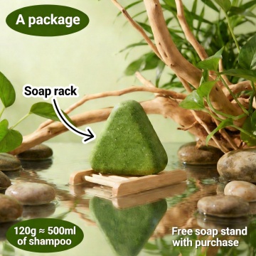 洗发水海报设计,两瓶深绿色透明液体洗发水瓶,搭配黑色按压泵头和白色标签,标签上有黑色文字与金色装饰细节,瓶身优雅放置于浅棕色木质树枝上。树枝下方是清澈湿润的水面,点缀着光滑石头,周围环绕着鲜活的绿色植物枝叶与根茎。整体采用清新自然的绿色调,柔和的侧光照明营造出宁静、有机、纯净的氛围,背景为渐变浅绿色。画面视觉层次清晰,以产品为绝对主体,光影效果细腻,水面呈现清晰的瓶身倒影,整体质感写实,设计简约自然,传达出天然植物萃取的产品特性。