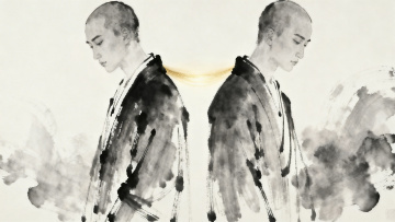 水墨风插画,青绿山水间松下打坐,虚实相生,营造清透柔和的虚拟自然意境。禅意,冥想