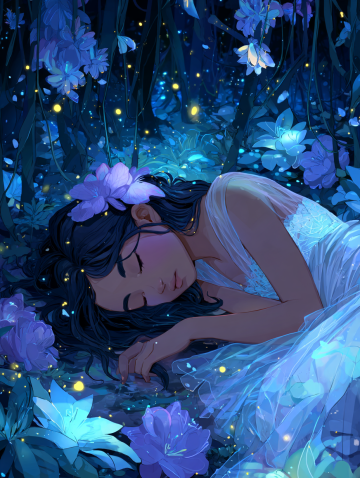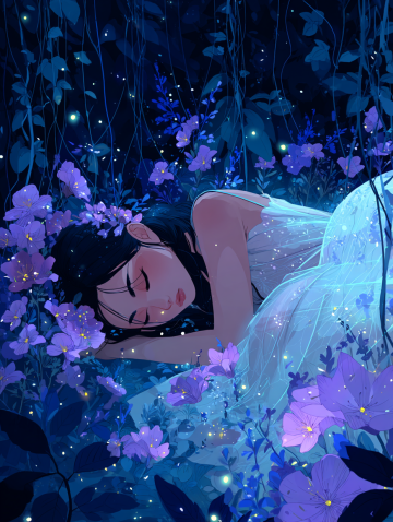 梦幻光影交织的秘境,少女步入星河倒映的溪流,插画风与粒子效果营造出唯美的虚拟自然,静谧中透着浪漫神秘。